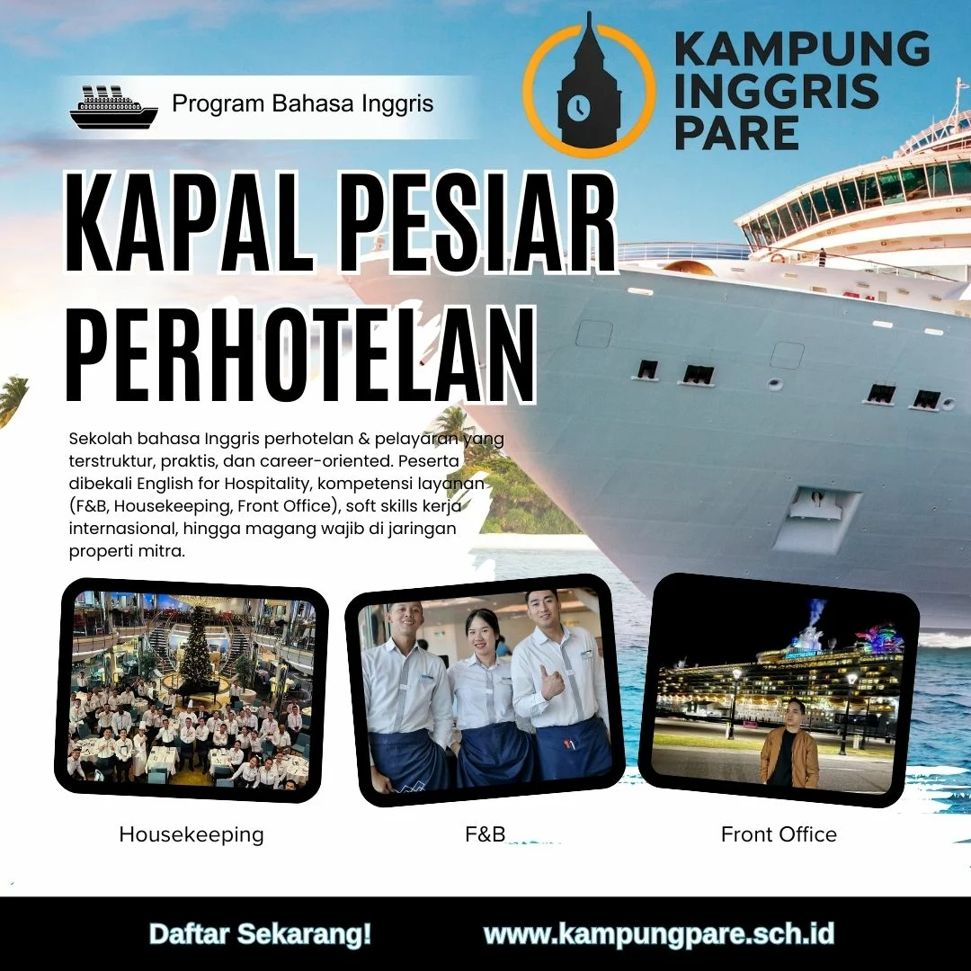 LKP Webster Kampung Inggris Pare menyelenggarakan Program Bahasa Inggris Kapal Pesiar & Perhotelan resmi—sebuah sekolah bahasa Inggris perhotelan & pelayaran yang terstruktur, praktis, dan career-oriented. Peserta dibekali English for Hospitality, kompetensi layanan (F&B, Housekeeping, Front Office), soft skills kerja internasional, hingga magang wajib di jaringan properti mitra. Kami mendampingi sampai peserta mendapatkan pekerjaan di jalur perhotelan atau kapal pesiar sesuai kualifikasi dan hasil seleksi.