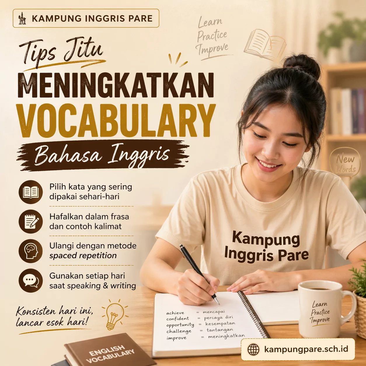 Itulah sebabnya banyak pemula merasa lebih percaya diri setelah fokus menambah kosakata yang benar-benar relevan dengan kebutuhan harian, sekolah, kerja, atau persiapan kursus di Kampung Inggris Pare.
